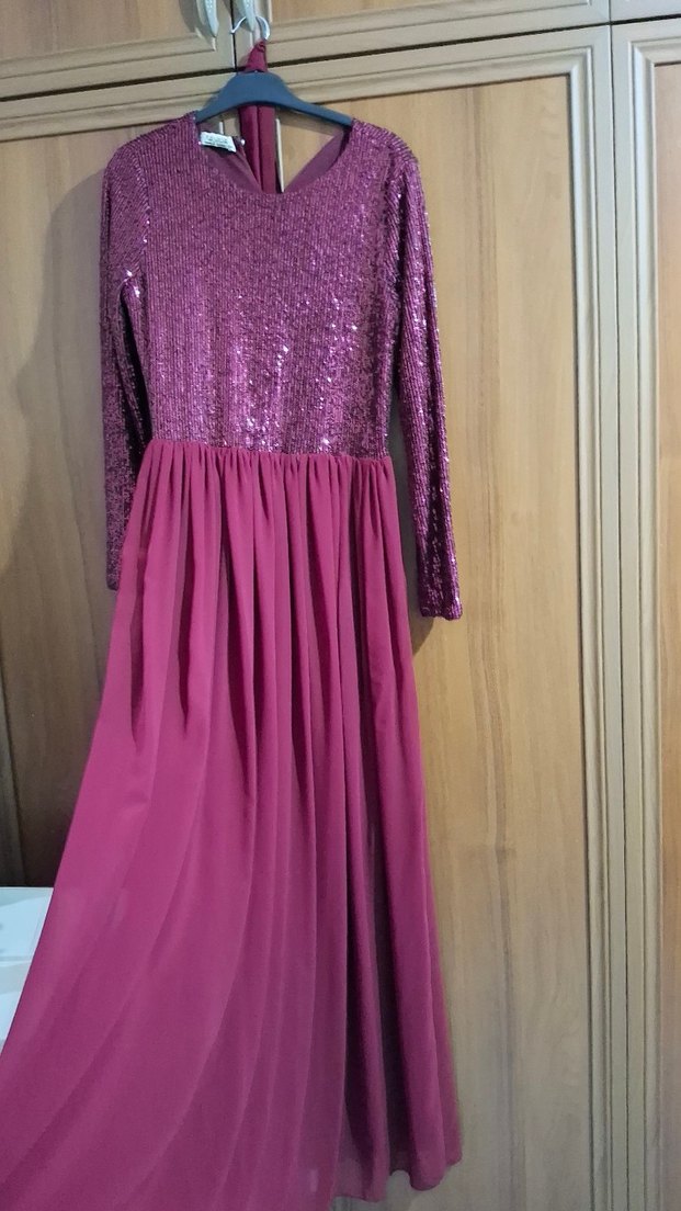 Parlak bordo üst kısmı uzun kollu ve yuvarlak yakalı, bol ve drapeli etek kısmına sahip kadın uzun abiye elbise. Düğünler için modern klasik tarzda şık bir seçim. Ürün Sadece bir kere kullanıldı S-M-L bedene rahatlıkla olur hiçbir deformesi yoktur alacak kişiye hayırlı olsun