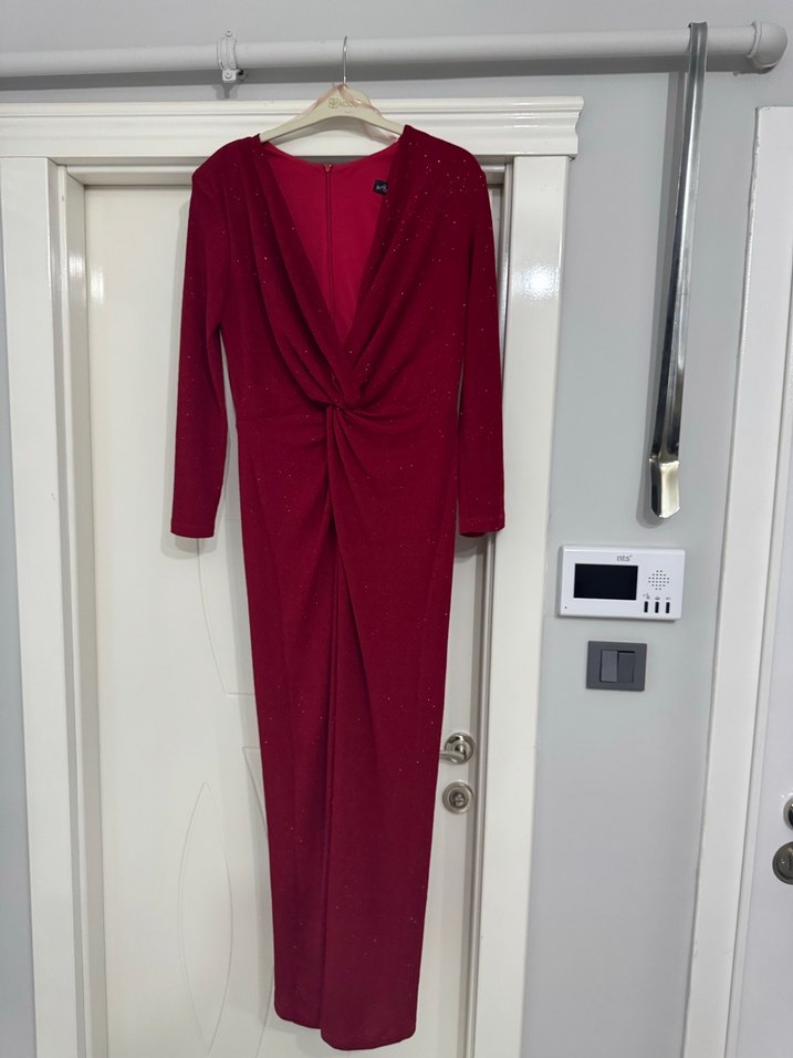 Bordo renkte, V yakalı, uzun kollu ve drapeli tasarıma sahip, modern klasik ve minimalist şıklıkta, fitted uzun abiye elbise. Saran esnek kumaştır, aşırı havalı kumaşı var iki saat giyildi ama bilezikten oraları azıcık çekildi çakmak ile yakılabilir. Çok havalı simli kumaştır.