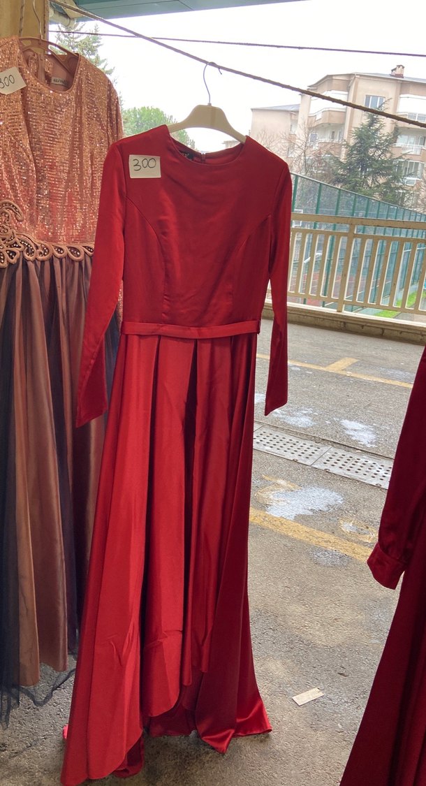Bordo Uzun Kollu Drapeli Kadın Abiye Elbise