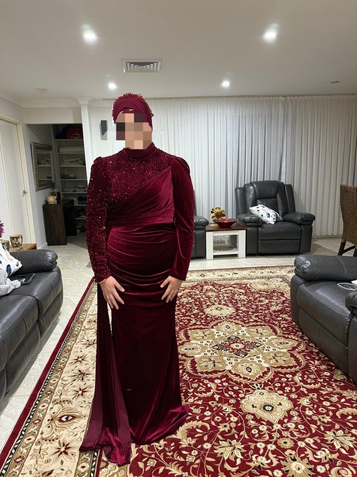 Bordo renkli, yüksek yakalı ve uzun kollu, drapeli desenli, vücuda oturan uzun abiye elbise. Düğünler için uygun, mütevazı ve gösterişli tarzda. Kınam için giymiştim yurt dışından aldım. Kadife kumaş pullu. Boyum 168.