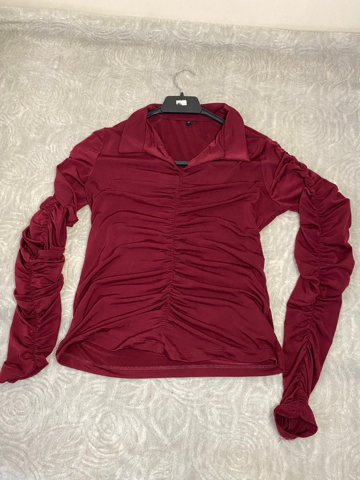 Bordo renkli, uzun kollu kadın bluz. Drapeli detayları ve yakalı tasarımıyla şık bir görünüm sunar. Sentetik yumuşak kumaştan, günlük kullanıma uygundur.