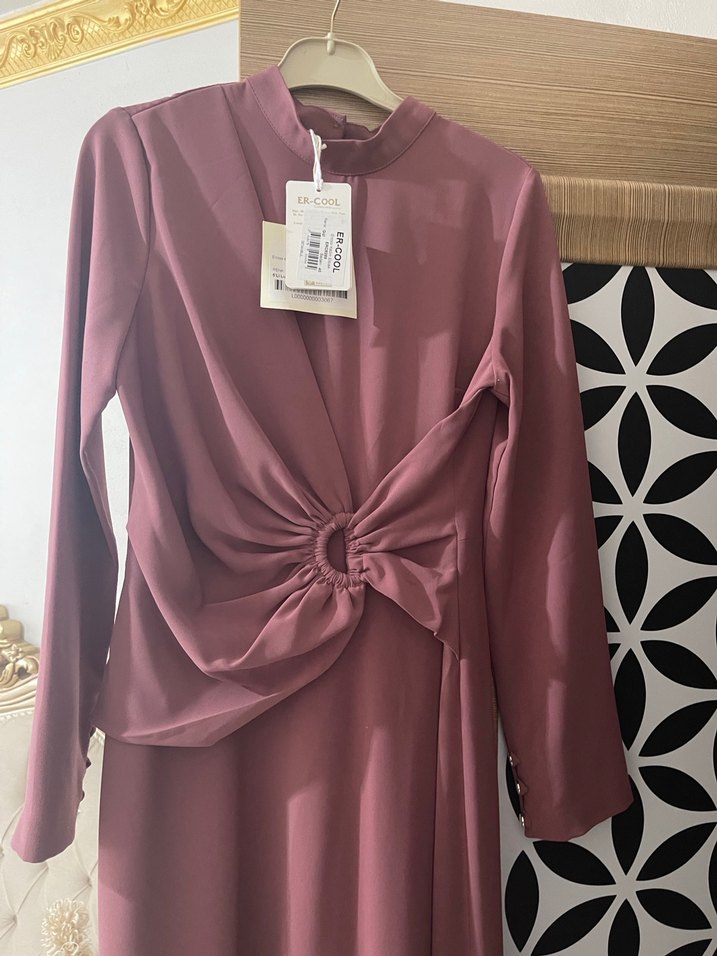 Bordo renk, uzun kollu, drapeli ve kruvaze yakalı bu kadın elbise, ince ve parlak kumaştan üretilmiştir. Modern klasik tasarımıyla romantik akşamlar için uygundur.