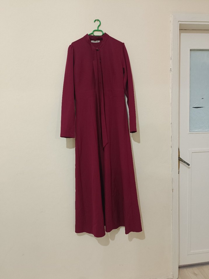 Bordo renkli, uzun kollu ve yüksek yakalı kadın elbisesi. İpek gibi kumaştan, drapeli tasarıma ve rahat kesime sahip, günlük kullanıma uygun. ✨