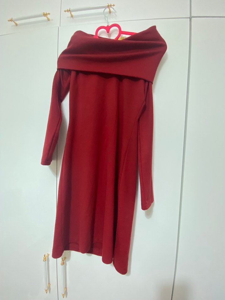 Bordo uzun elbise, drapeli yüksek yakası ve uzun kollu, vücuda oturan kesimiyle sıcak ve yumuşak kumaştan üretilmiştir. S-M beden