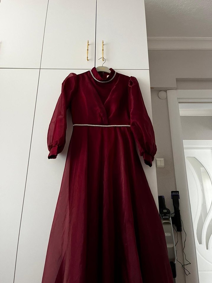 Bordo renkli, uzun kollu ve yüksek yakalı bu uzun elbise, bol kesimi ve drapeli tasarımı ile vintage ve modern klasik bir şıklık sunar.