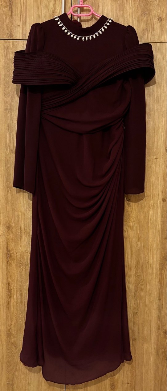 Bordo renkli, uzun kollu ve yüksek yakalı bu şık kadın elbisesi, ipeksi kumaştan ve drapeli detaylarla hazırlanmıştır, düğünler için uygundur. 1 kere giyildi. Herhangi bir deformasyon yoktur. 40-42 beden uyumludur. Boy uzunluğu yaptırılabilir.