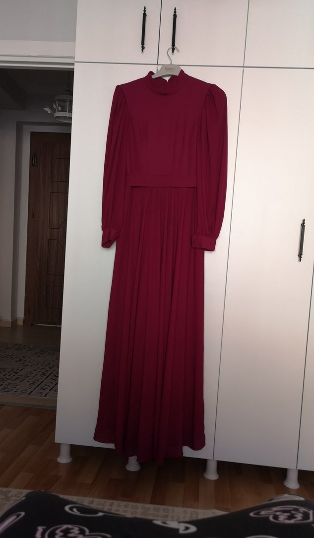 Bordo uzun elbise, drapeli ve bol kesimdir. Uzun kollu ve yüksek yakalıdır. İpek gibi kumaştan yapılmıştır, vintage ve modern klasik tarzını yansıtır, düğün için uygundur.