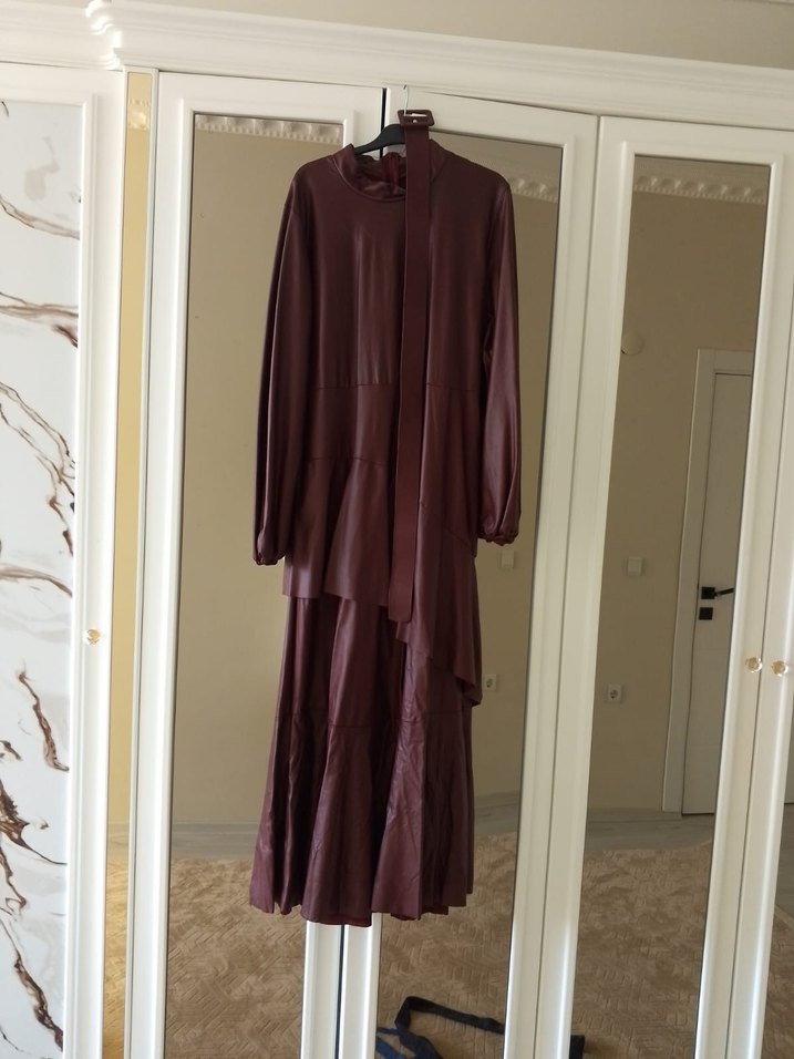 Bordo renkli, yüksek yakalı ve uzun kollu, satenimsi kumaştan yapılmış drapeli uzun elbise. Ofis için bohem ve Paris tarzına uygun, regular fit.