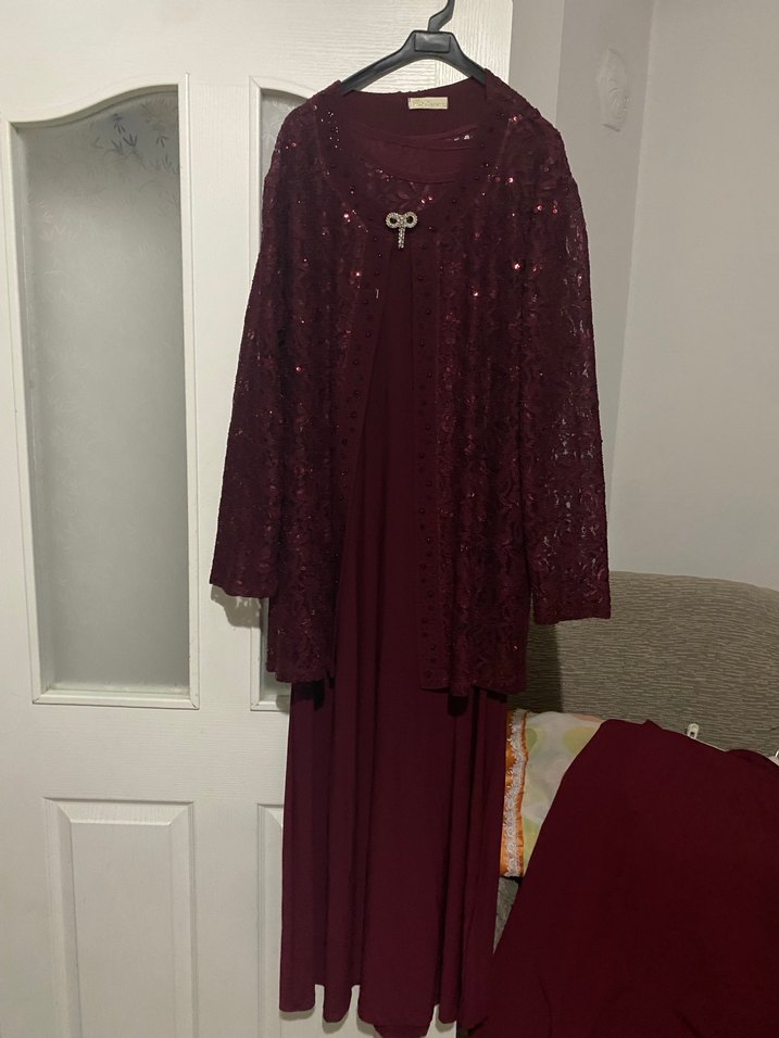 Bordo renkte, yüksek yakalı, uzun kollu ve drapeli detaylara sahip bol kesim uzun elbise. Yumuşak sentetik kumaştan, düğün için uygun