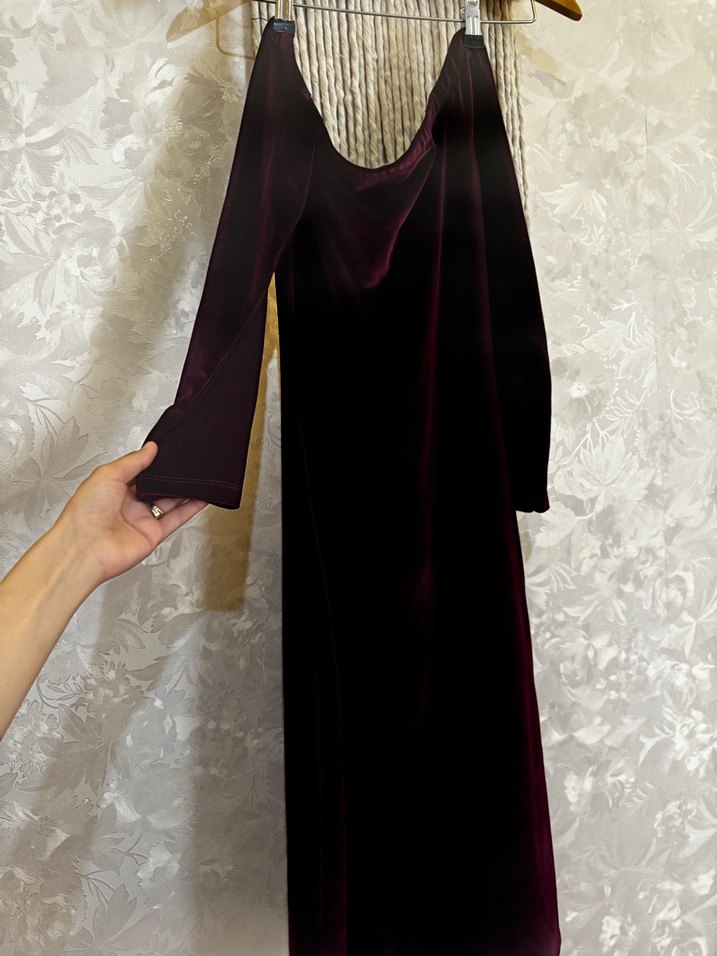 Bordo renginde, uzun kollu ve drapeli, tek renk, tek parça, saten görünümlü kumaştan yapılmış, tek parça uzun elbise.