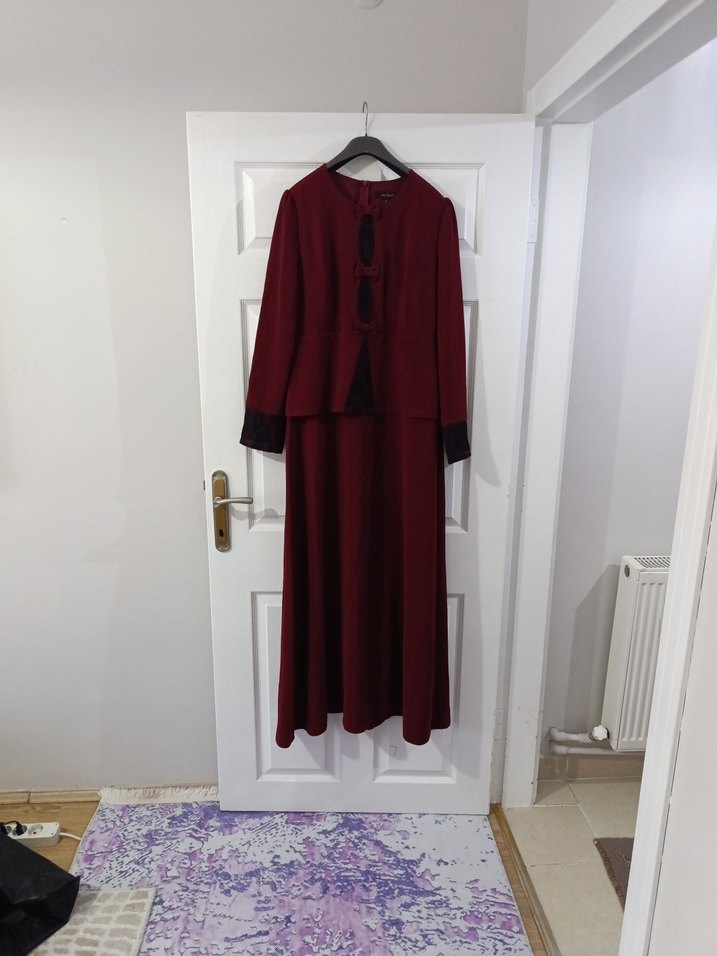 Bordo renkli, uzun kollu ve yakası kesimli, ipeksi kumaştan yapılmış drapeli uzun elbise. Ofis kullanımı için uygun, klasik şıklık sunar.