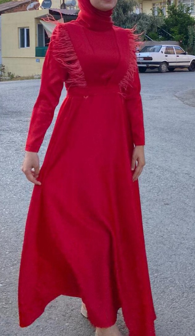 Bordo renkli, parlak sentetik, satenkumaştan, bol kesim ve drapeli tasarıma sahip uzun elbise. uzun kolludur, düğün gibi avangart etkinlikler için uygundur. bel bölgesinde kemer yerinden dolayı puturlenme olmuş o da kemerle kapanıyor zaten