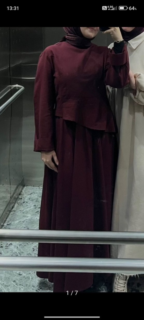 Bordo renkte, uzun kollu ve yüksek yakalı drapeli kadın elbisesi. Regular kesim, sade ve ofis kullanıma uygun, sentetik kumaştan üretilmiştir.