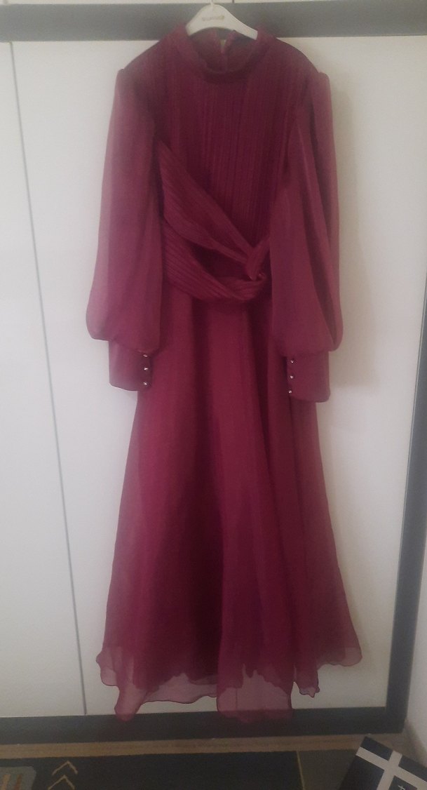 Bordo renkte, uzun kollu ve yüksek yaka drapeli kadın elbisesi. İpek gibi kumaştan, bol kesim ve vintage esintili modern klasik tasarım. Düğün için uygun, desensiz şıklık.
