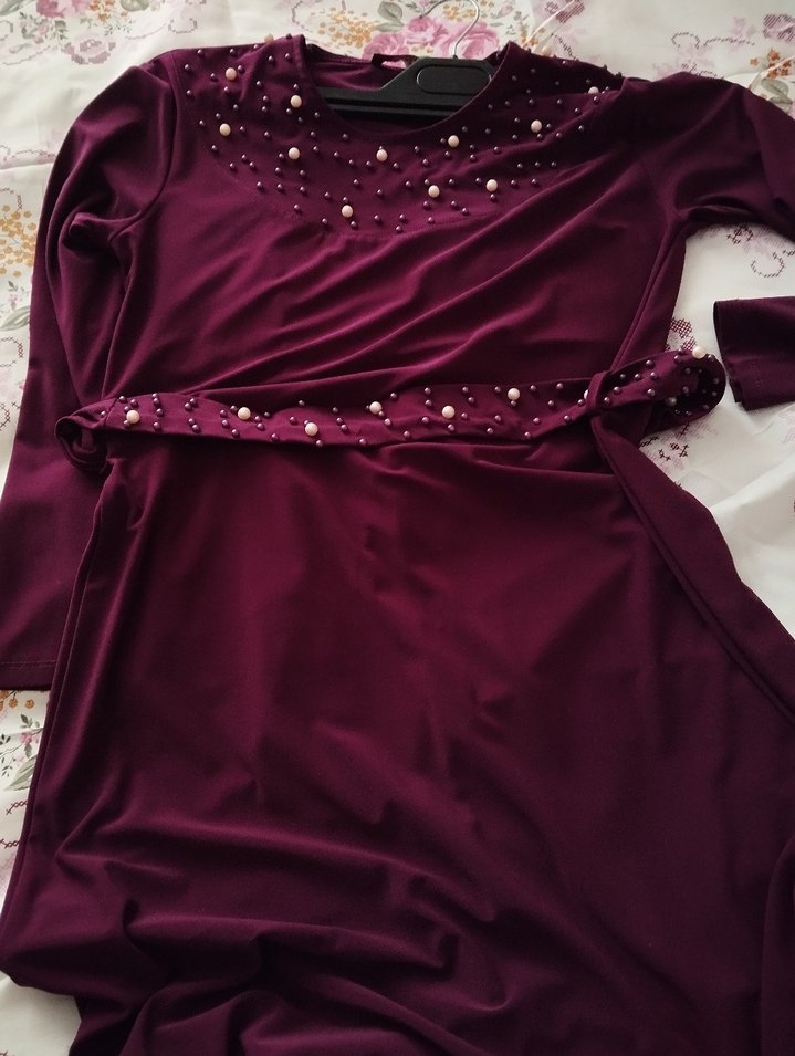 Bordo renkte, drapeli ve vücuda oturan uzun elbise. İnce, ipeksi kumaştan, uzun kollu ve yuvarlak yakalı. İnci detaylarıyla şık bir görünüm sunar. Düğünler için uygun. s ve m uyumludur