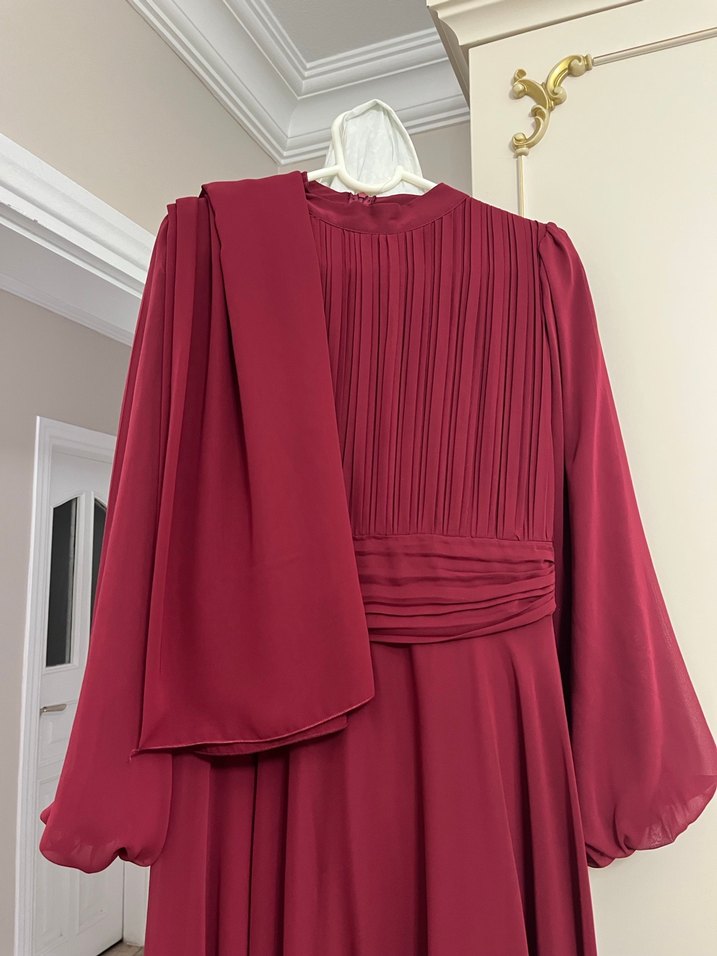 Bordo Uzun Kollu Drapeli Kadın Elbise+ŞAL