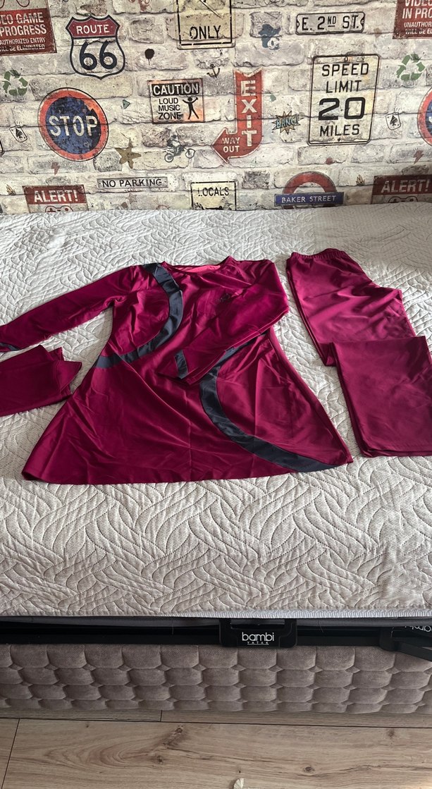 Bordo renkte, uzun kollu, drapeli ve V yakalı kadın haşema. Sentetik kumaştan, şık ve modern bir athleisure stil sunar. ♀️rengi vişneye de benziyor, 5 ten az giyildi