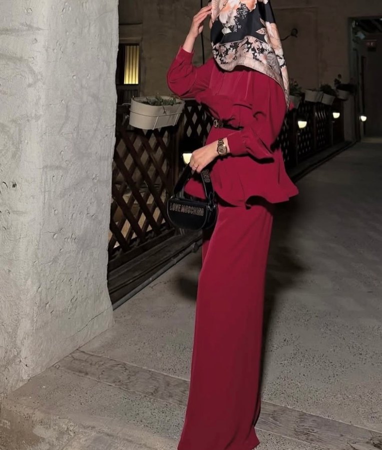 Bordo renkli, uzun boy ve regular fit kadın takımı. Yüksek yakalı, uzun kollu, desenli ve drapeli ipeksi kumaştan, klasik zarafet ve Paris sokak modası tarzında, günlük kullanım için uygun. Kaliteli bir butikten aldım 36/38/40 uyumlu