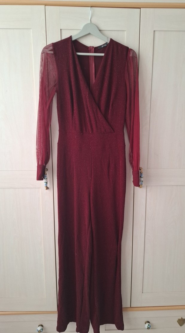 Bordo renkli, v yaka ve uzun tül kolları olan, drapeli önüyle modern klasik tarzda, ofis için uygun dar kesim tulum. ✨