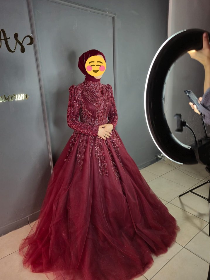 Bordo renk, yüksek yakalı ve uzun kollu drapeli detaylara sahip, desenli, modest ve klasik kesim kına kıyafeti.