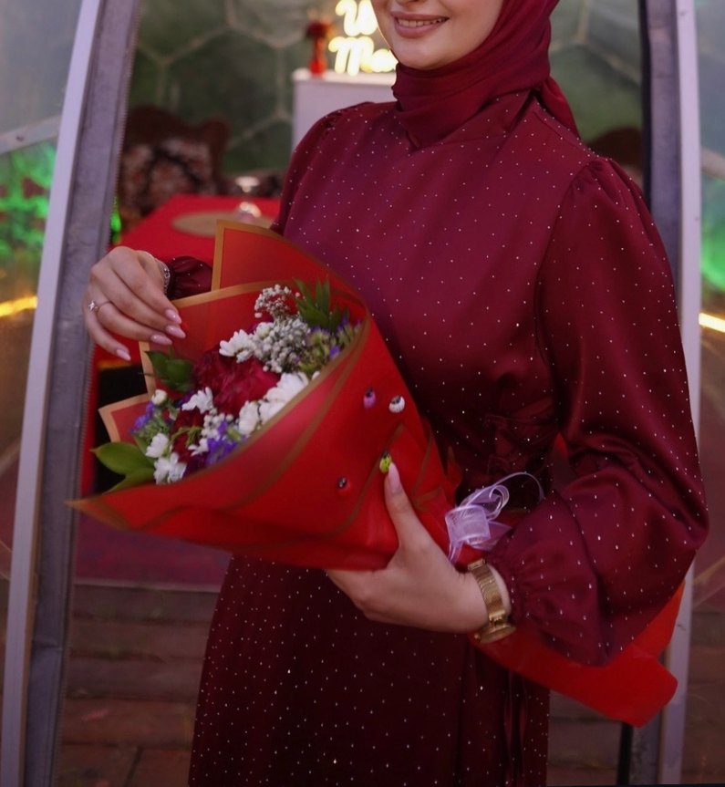 Bordo, uzun kollu, yüksek yakalı, ve vücuda oturan yanları ipli gösterişli bir düğün için uygundur .sadece 1 kez evlilik teklifinde giydim şalı ayrı ücrettedir.