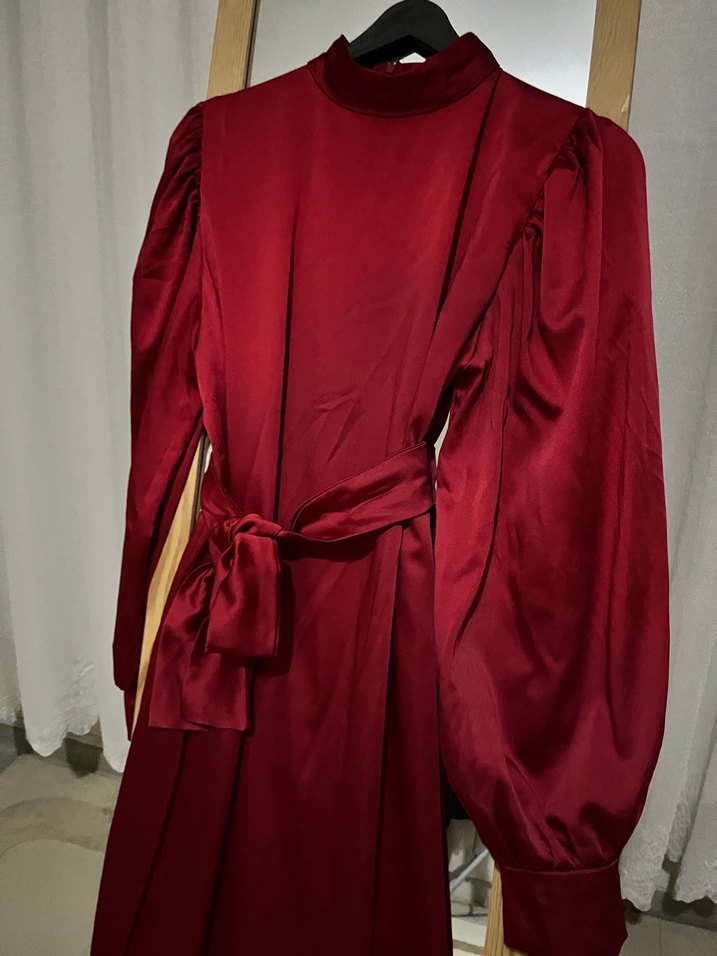 Bordo renkli, uzun kollu, yüksek yakalı, drapeli ve saten kumaştan üretilmiş bol kesim elbisedir. Parlak dokusu ve şıklığıyla düğünlere uygundur.