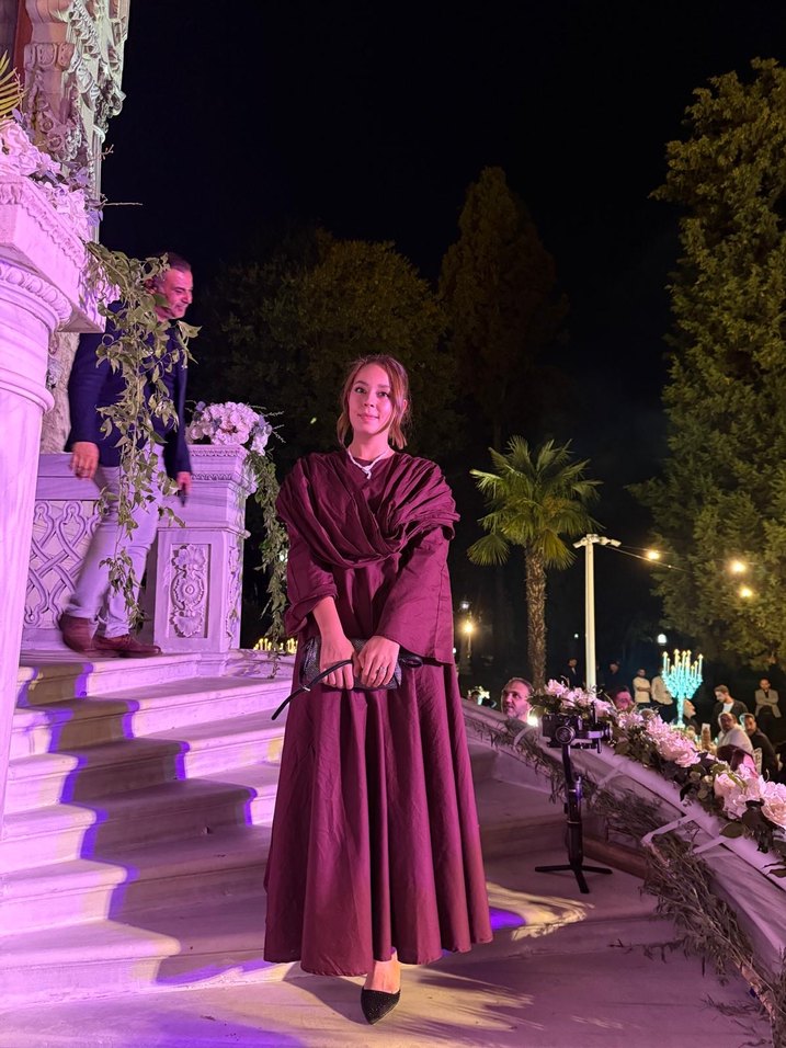 Bordo renkli, straplez yaka ve uzun kollu, drapeli, bol kesim kadın elbisesi. Tie-dye desenlidir ve düğün için uygundur. 1 defa kullandım