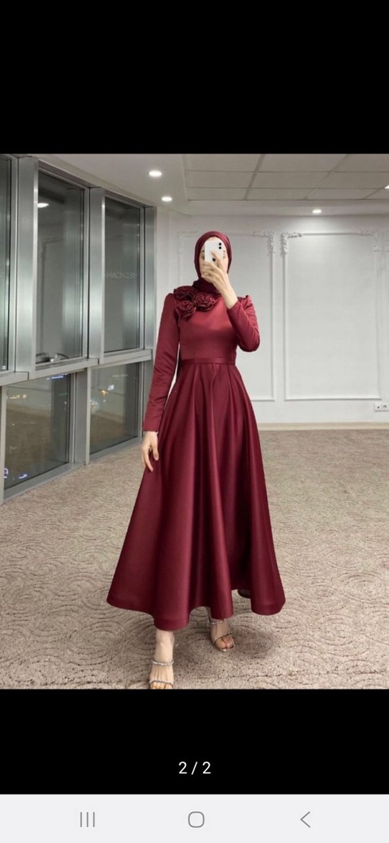Bordo renkli, yüksek yakalı ve uzun kollu, bol kesim bir abiye. Omuzda drapeli ve çiçek detayları bulunan, düğünler için uygun bir model.