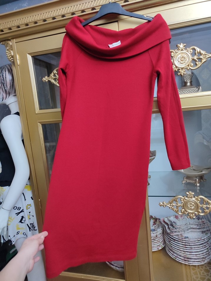 Bordo parlak renkte, uzun kollu ve drapeli kayık yaka detaylı, vücuda oturan triko elbisedir. muhteşem
