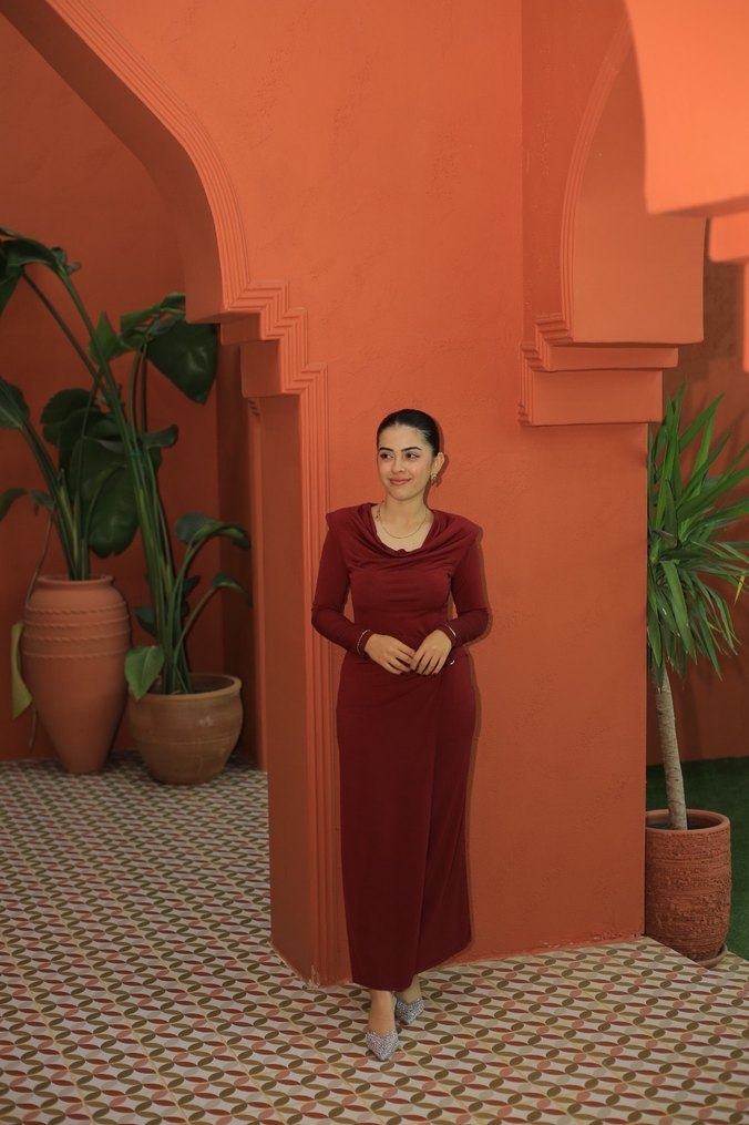 Bordo renk, uzun kollu, drapeli V yaka ve ince kesim bu uzun elbise, ipeksi kumaştan yapılmıştır. Minimalist ve sade bir görünüme sahiptir. Sadece 1 defa kullanılmıştır