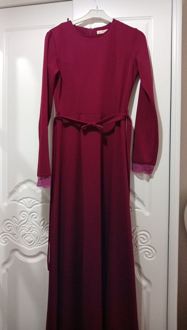 Bordo renkli, uzun kollu ve yüksek yakalı bu dar kesim elbise, sentetik kumaştan üretilmiş. Drape detaylı ve kemerli, klasik ve minimalist tarzda, düğünler için uygun.