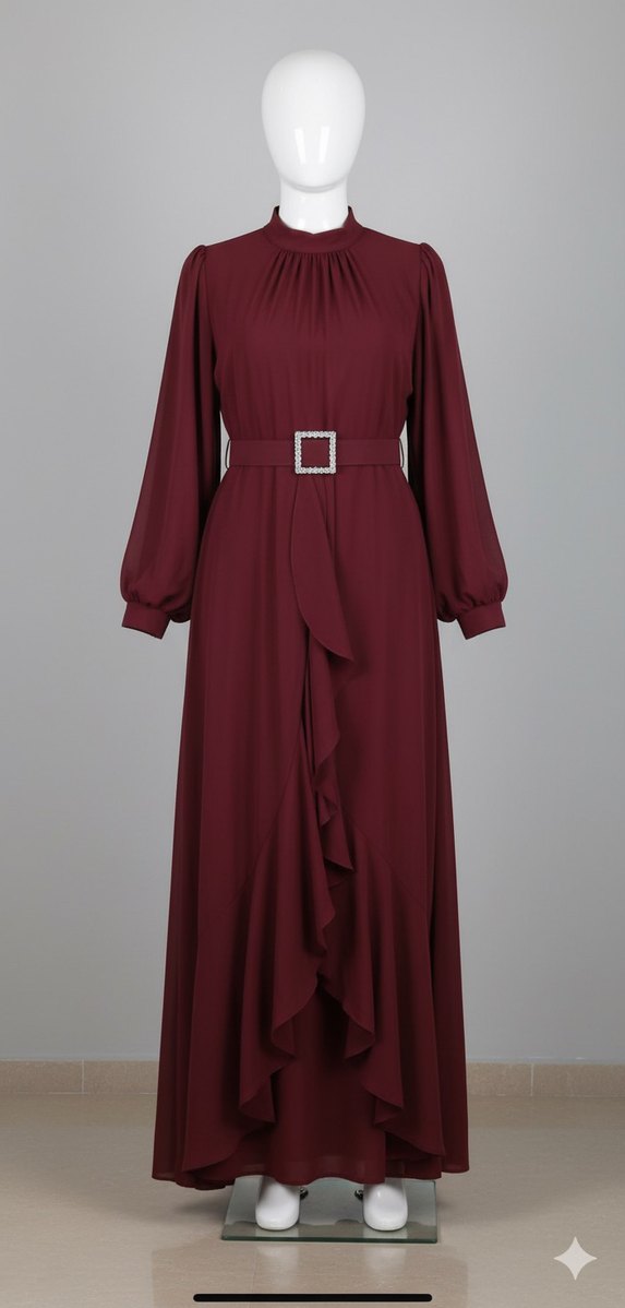 Bordo renkli, yüksek yakalı ve uzun kollu bu uzun elbise, bol kesim ve drapeli detaylara sahiptir. Kemerinde dekoratif tokası vardır. Ofis için uygundur. Bir kez kullanıldı