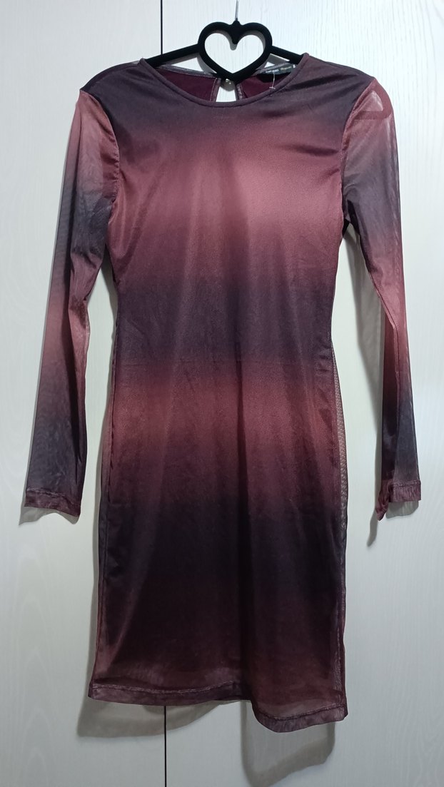Bordo renkli, uzun kollu ve yüksek yakalı bu dar kesim elbise, koyu tonlarda batik desenlere sahiptir. Drapeli detaylarıyla gotik ve şık bir görünüm sunar.