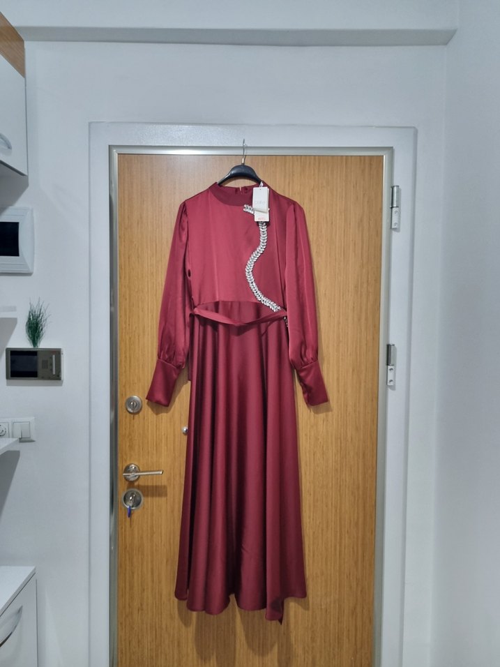 Bordo renkli, abiye iki gogus arasi 38 cm boyuda 138 cm