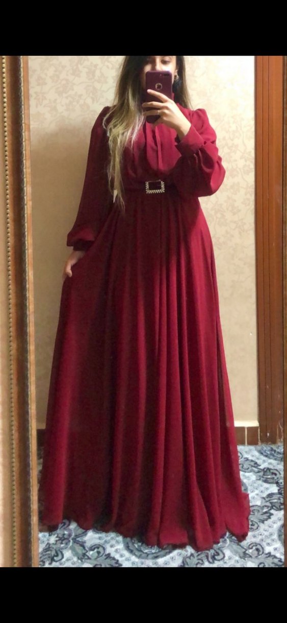 Bordo renkte, yüksek yakalı ve uzun kollu, drapeli detaylara sahip, dökümlü uzun elbise.