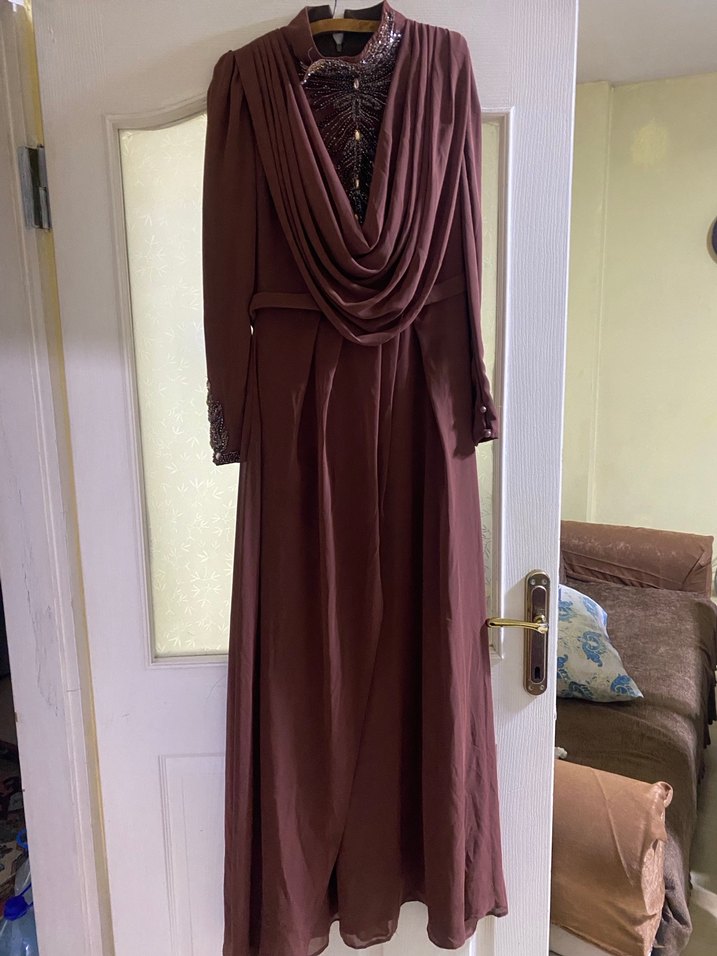 Bordo renkli, yüksek yakalı ve uzun kollu bu uzun elbise, drapeli ön kısmıyla klasik ve vintage bir tarz sunar. Ofis kullanımı için uygundur ve düz desensizdir.