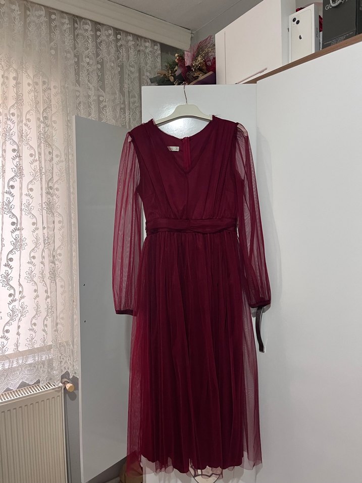 Bordo Uzun Kollu Drapeli Uzun Elbise