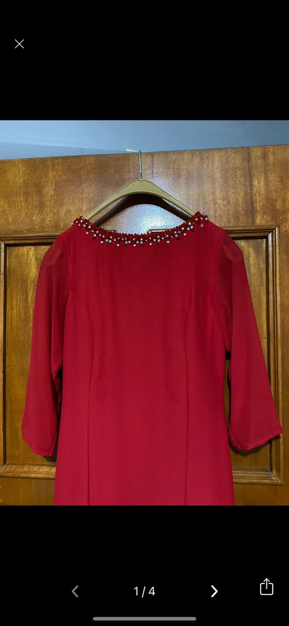 Bordo renk, inci işlemeli tekne yaka, uzun kollu, drapeli ve vücuda oturan kesime sahip parıltılı vintage abiye elbisedir. Düğün için uygundur.