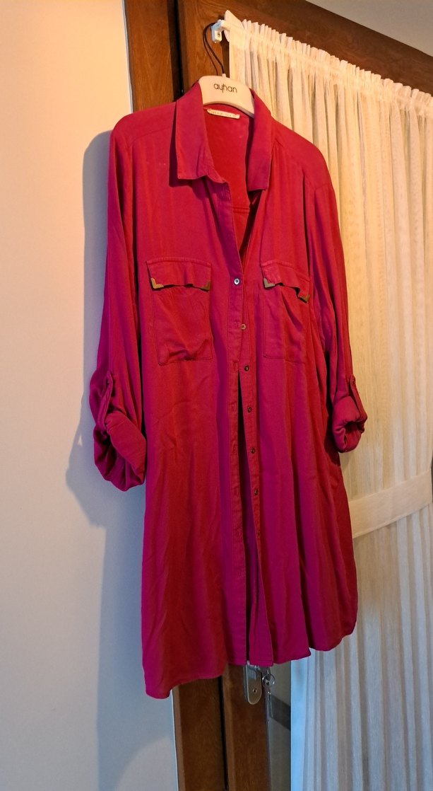Bordo renkli, uzun kollu ve düğmeli, yakalı bohem tarzında bol kesim tunik. yumusak dokusu ve parlak görünümüyle günlük kullanıma uygundur. çok minik lekesi var onunda resmini attım zaten beden XXL