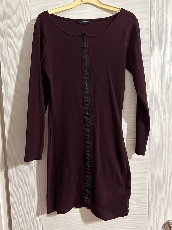Bordo renk, uzun kollu ve tek renk düğmeli önüyle mini boy elbise. Minimalist ve gotik tarzı yansıtan şık kesim.