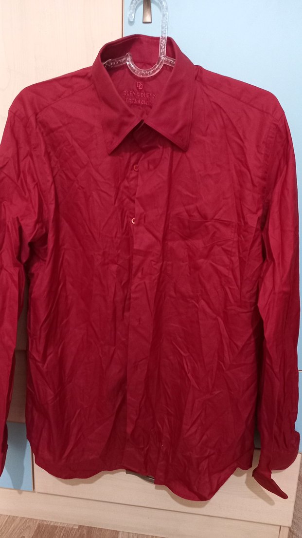 Bordo renkli, uzun kollu, düğmeli ve yakası kesimli erkek gömlek. Parlak, ipeksi kumaştan, normal boyda, iş ve ofis için uygun.