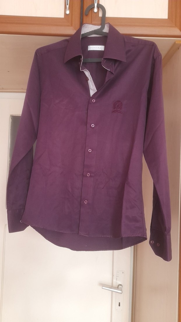 Bordo renkli, parlak ve ipeksi dokulu erkek gömlek. Düğmeli, uzun kollu ve normal kesim, kesik yaka detayıyla ofis ve günlük kullanıma uygun.