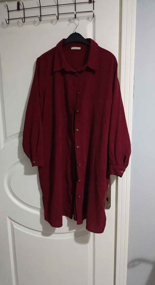 Bordo renkli, uzun kesim, düğmeli gömlek Keten kumaştan, uzun kollu ve notched yakalı, bohem Paris tarzında.