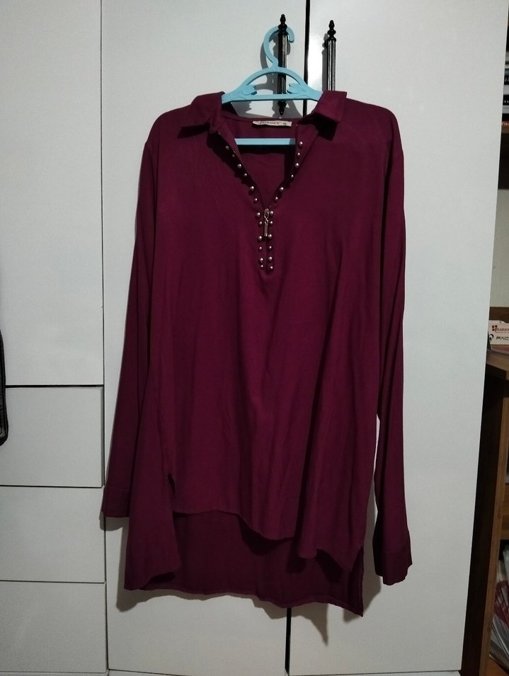 Uzun kollu, düğmeli ve yakalı bordo gömlek, bol kesim ve minimalist tasarıma sahip. Günlük kullanıma uygundur.