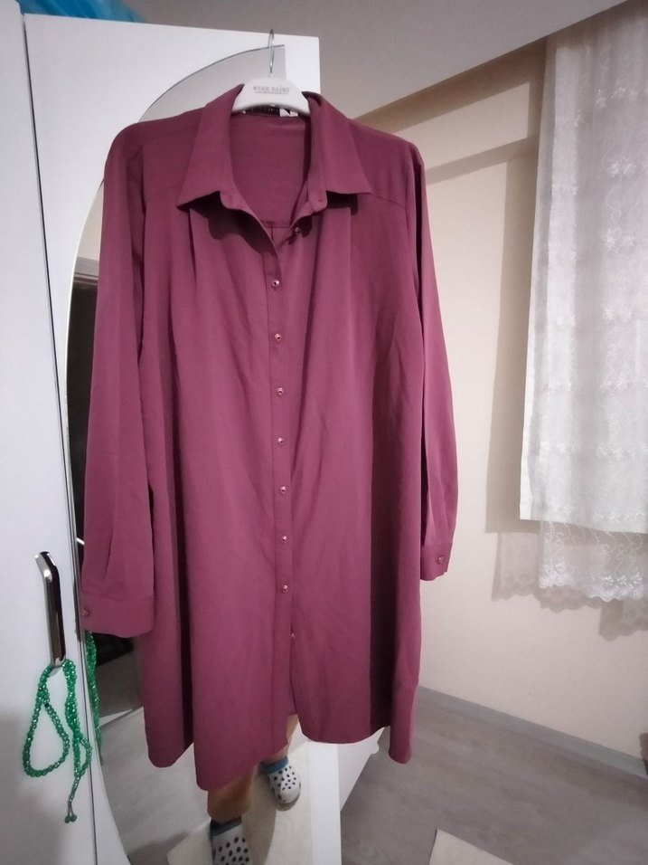 Bordo renkli midi uzunlukta, düğmeli ve yakalı yaka detaylı, uzun kollu bol kesim tunik. Yumuşak sentetik kumaştan üretilmiş, ofis için uygun. Ürün ikili takım