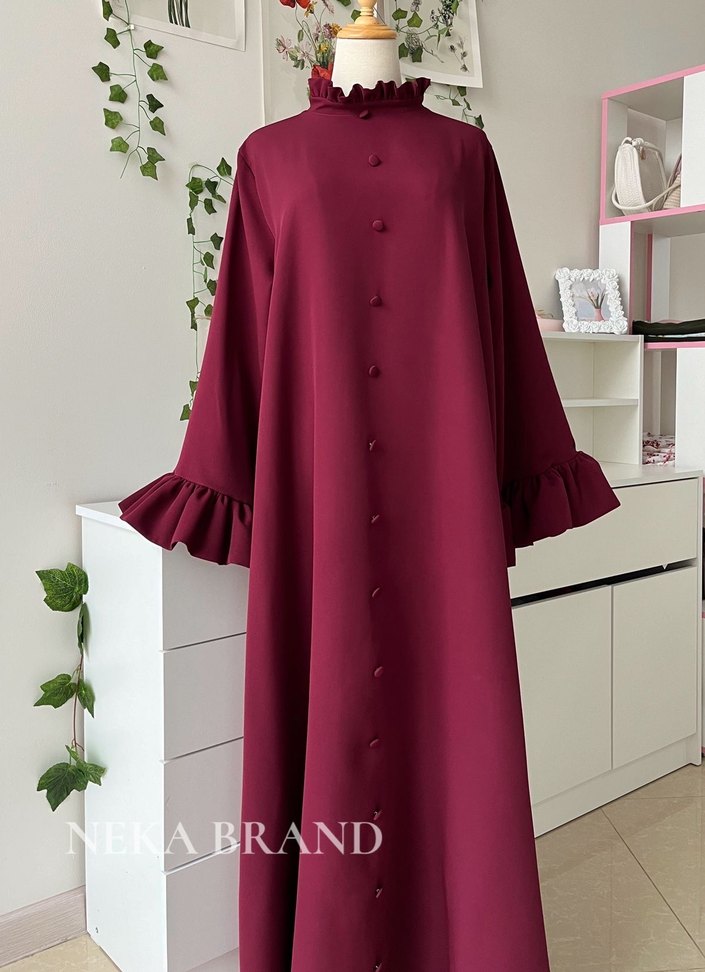 Bordo renkli, yüksek yakalı ve düğmeli uzun elbise. İnce nakış detaylı, dabıl krep kumaştan, uzun kollu ve volanlı manşetli, sade ve bohem tarzda.
