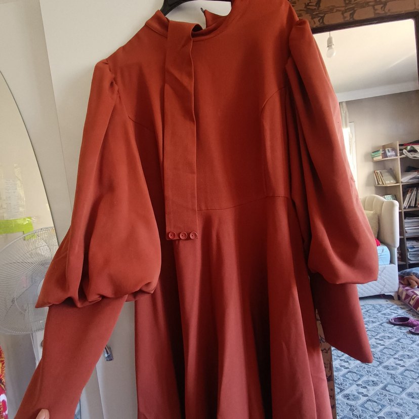 Bordo renkli, yüksek yakalı ve düğmeli uzun elbise, ipeksi kumaştan, bol kesim ve uzun kolludur. Ofis, düğün için uygundur. ✨ Bir defa giyildi tertemiz