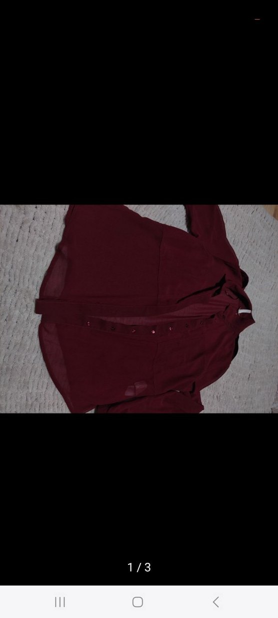 Bordo renk, uzun kollu ve düğmeli önü olan bu dar kesim kadın gömleği, notched lapel yakaya sahiptir ve sentetik kumaştan üretilmiştir. Günlük kullanıma uygundur.