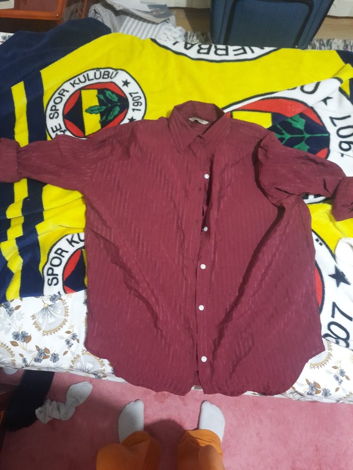 Bordo renkli, uzun kollu, düğmeli, yakalı ve bol kesim kadın gömleği. Sentetik kumaştan üretilmiş, günlük ve sokak stiline uygundur.