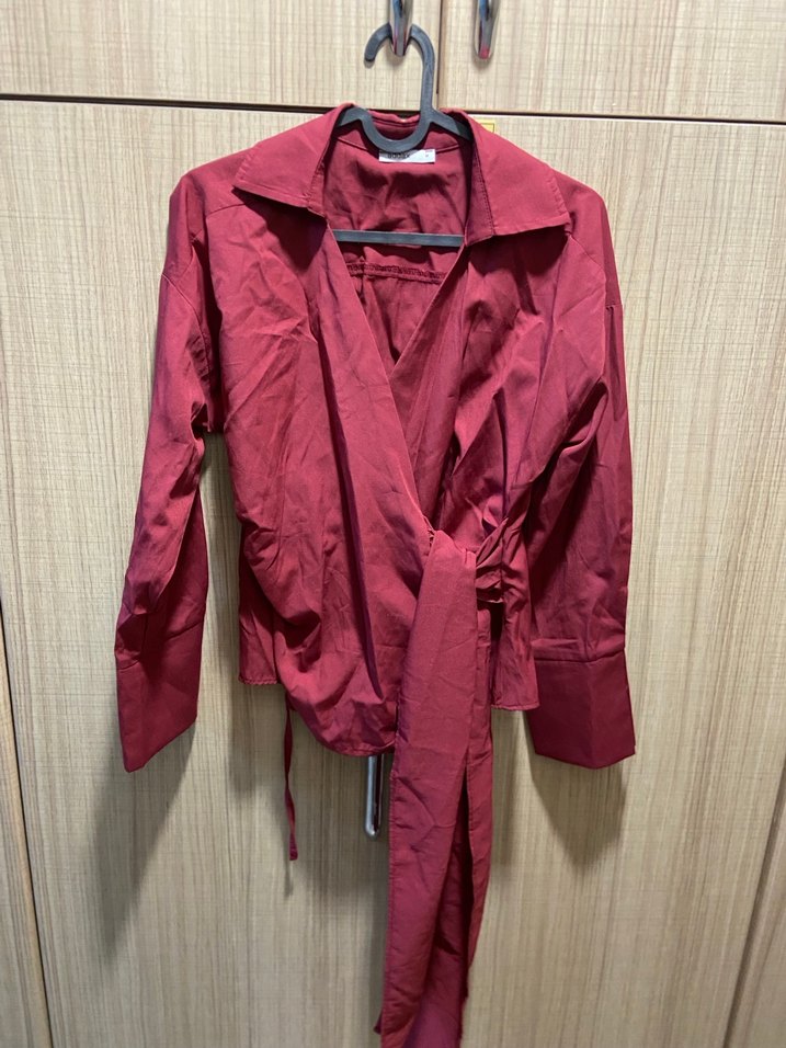 Bordo renkli, uzun kollu, yakalı ve düğmeli kadın gömleği. Belde bağlama detayı ve normal kesimi ile ofis stiline uygun minimal tasarım.